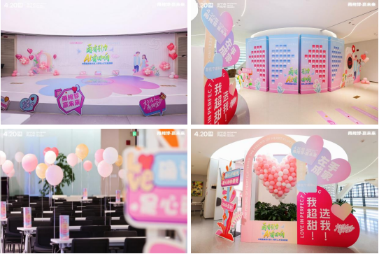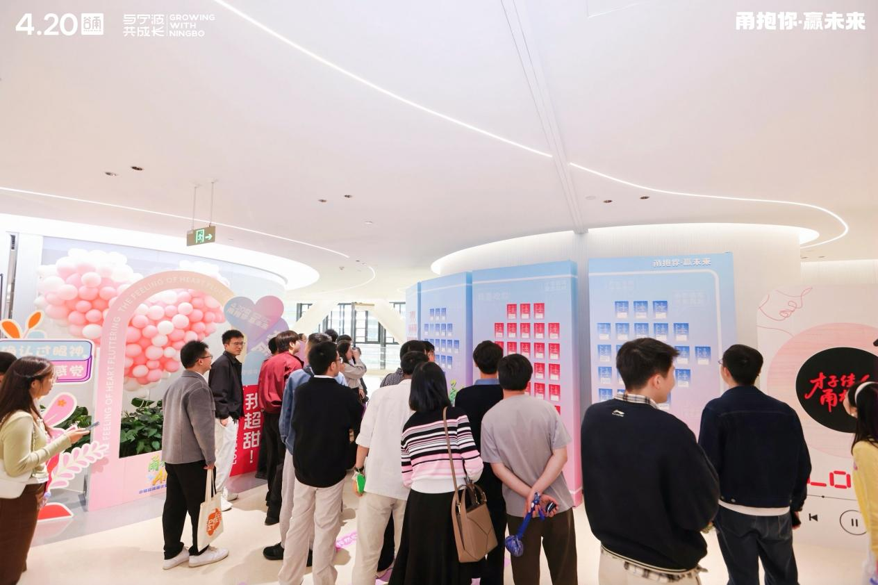 步入活动现场,仿佛跌入一场蓝粉渐变的仲夏夜之梦,气球与繁花织就浪漫穹顶,主舞台“AI有回响”的字样在星光下闪烁着科技与未来的微光;脚下是繁花铺就的“心动之路”,指引着青年们走向“甬抱你”的温暖怀抱。