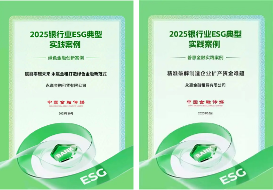 本次活动汇集了银行机构、金租公司、信托公司、消费金融公司等在绿色金融、普惠金融、公司治理等多个领域的优秀实践成果。永赢金融租赁有限公司(以下简称“永赢金租”)申报的两项特色案例在众多参评项目中脱颖而出,其中,“精准破解制造企业扩产资金难题”入选“2025银行业ESG普惠金融典型实践案例”,“赋能零碳未来,打造绿色金融新范式”获评“2025银行业ESG绿色金融典型实践案例”。